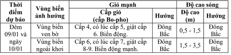 Trên đất liền: Từ chiều tối 9/1, gió Đông Bắc mạnh dần lên cấp 3, cấp 4; vùng ven biển cấp 4, cấp 5, giật cấp 6; khu vực Hà Tĩnh trời rét. Trong đợt không khí lạnh này, nhiệt độ thấp nhất phổ biến 12 - 14 độ C, vùng núi 9 - 11 độ C. Trời rét kéo dài có khả năng ảnh hưởng tới sức khỏe của người dân và cây trồng, vật nuôi.