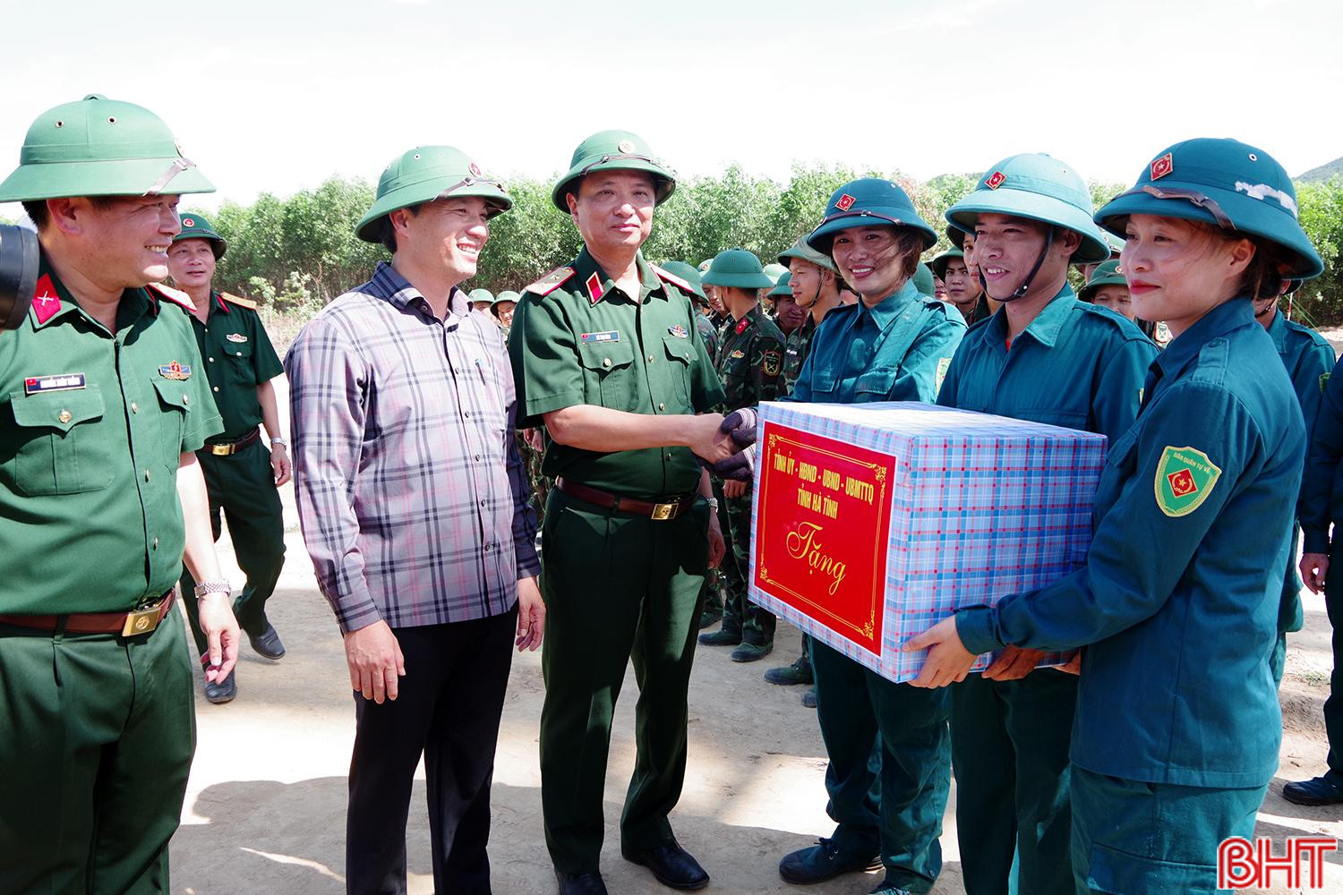 Trung tướng Hà Thọ Bình - Tư lệnh Quân khu và Bí thư Tỉnh ủy Hoàng Trung Dũng tặng quà động viên lực lượng dân quân tự vệ huyện Cẩm Xuyên