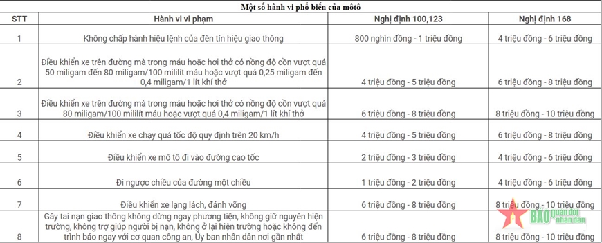 Một số mức xử phạt hành vi phổ biến của môtô.