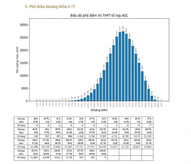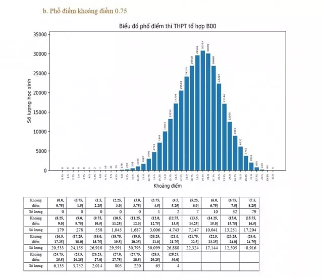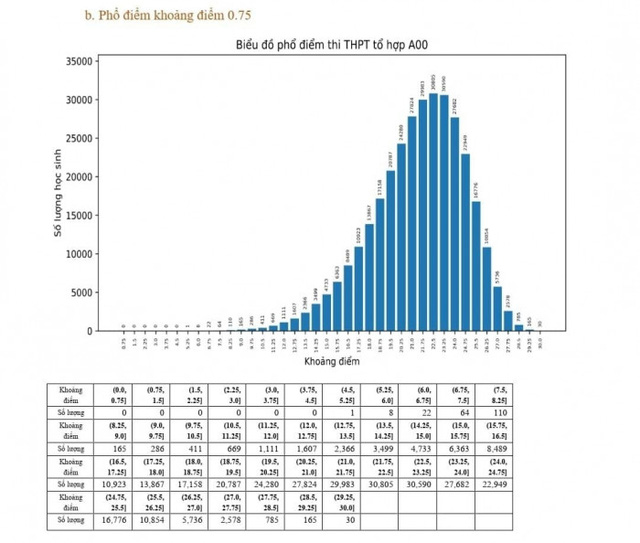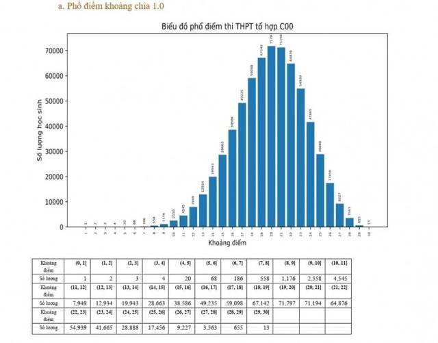 Cụ thể: phổ điểm khối A00 cao nhất khi đỉnh rơi vào 22,5 điểm. Tổ hợp thấp nhất là D01 khi đỉnh ở ngưỡng 18,5-19 điểm. Đối với 2 tổ hợp A01 và B00, đỉnh của 2 khối đều rơi vào ngưỡng 20-20,5 điểm. Ở khối C00, đỉnh vẫn nằm ở ngưỡng 20.