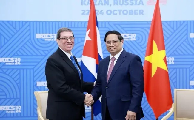 Ngày 24/10, theo giờ địa phương, nhân dịp tham dự Hội nghị thượng đỉnh các nhà lãnh đạo Nhóm BRICS mở rộng tại Kazan, Liên Bang Nga, Thủ tướng Chính phủ Phạm Minh Chính đã tiếp Bộ trưởng Ngoại giao Cuba Bruno Rodriguez Parrilla.