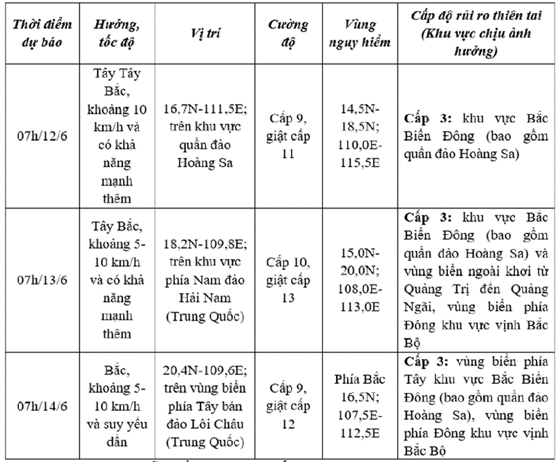 Khu vực Bắc Biển Đông (bao gồm vùng biển quần đảo Hoàng Sa), phía Bắc khu vực giữa Biển Đông có mưa dông và gió mạnh cấp 6-7, vùng gần tâm bão đi qua cấp 8-9, giật cấp 11, sóng biển cao 3,0-5,0m, biển động rất mạnh; phía Nam khu vực giữa Biển Đông, khu vực Nam Biển Đông (bao gồm vùng biển quần đảo Trường Sa) có gió Tây Nam mạnh cấp 6, có lúc cấp 7, giật cấp 8-9, sóng biển cao 2,0-4,0m, biển động mạnh.