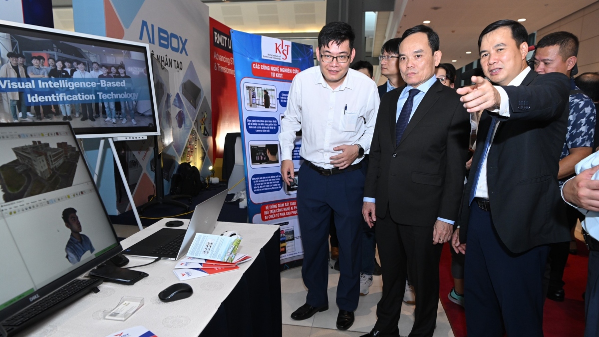 Phó Thủ tướng Trần Lưu Quang (ở giữa) và Thứ trưởng Bộ KH&CN Bùi Thế Duy (ngoài cùng bên phải) đang thăm các gian hàng tại Ngày hội Trí tuệ nhân tạo Việt Nam 2024