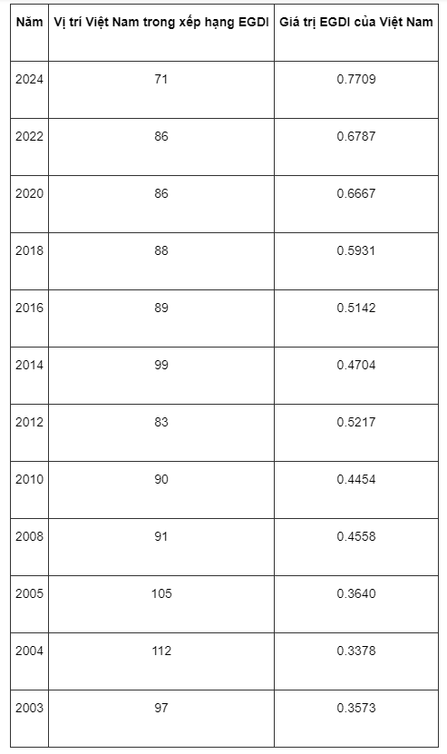 Trong bảng xếp hạng năm 2024, Việt Nam đứng vị trí thứ 71 trong 193 quốc gia thành viên Liên hợp quốc, tăng 15 bậc so với năm 2022. Với kết quả này, Việt Nam lần đầu tiên được xếp vào nhóm EGDI ở mức Rất cao và vươn lên vị trí xếp hạng cao nhất kể từ khi bắt đầu tham gia đánh giá EGDI của Liên hợp quốc năm 2003.