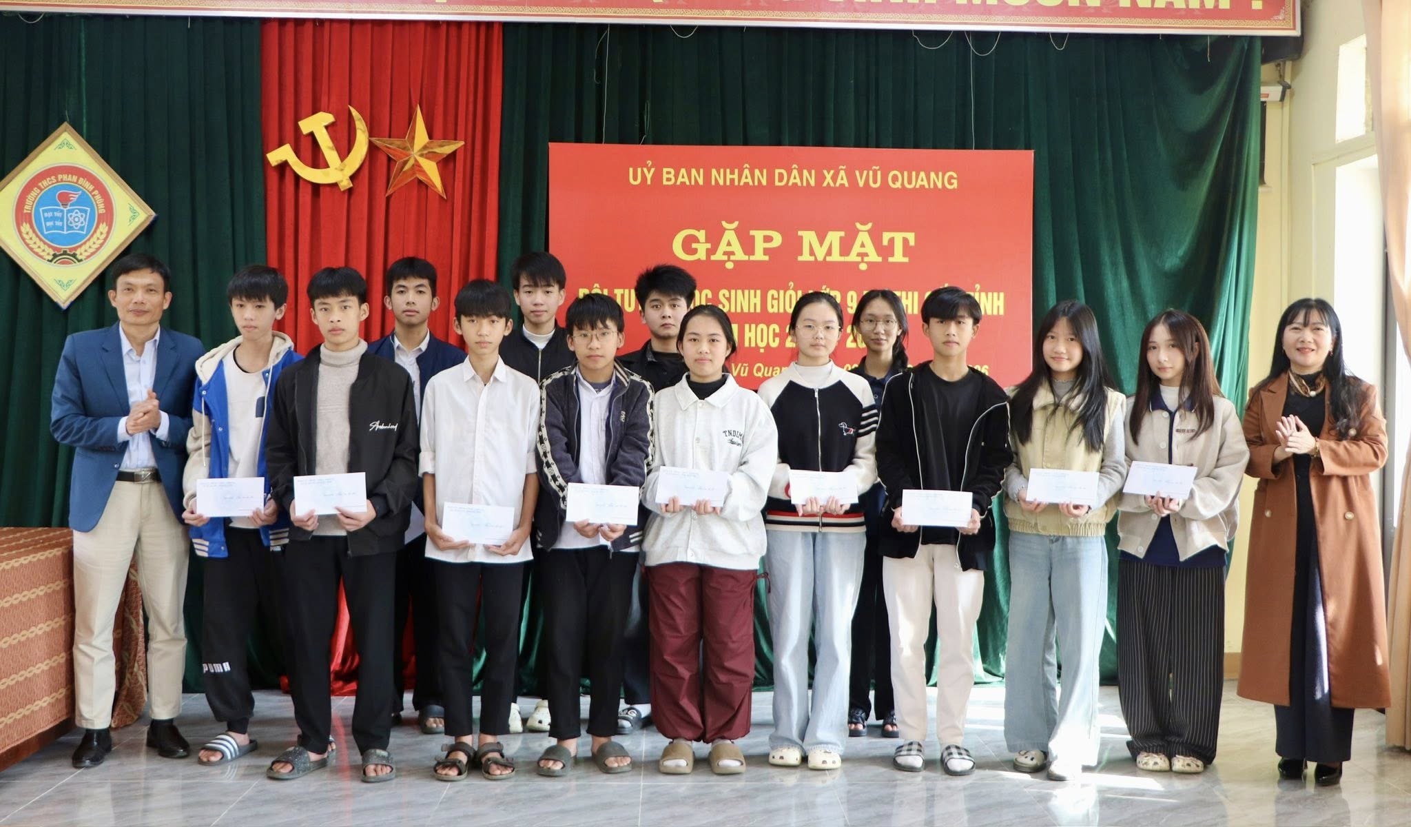 Buổi gặp mặt diễn ra trong không khí ấm áp, phấn khởi với sự tham dự của các đồng chí Phan Hồng Yến – Phó Bí thư Đảng ủy, Chủ tịch UBND xã Vũ Quang; Nguyễn Viết Luận – Trưởng phòng Văn hóa – Xã hội, đại diện Ban Giám hiệu, các thầy cô giáo phụ trách bồi dưỡng học sinh giỏi cùng các em học sinh đến từ các trường THCS trên địa bàn xã.