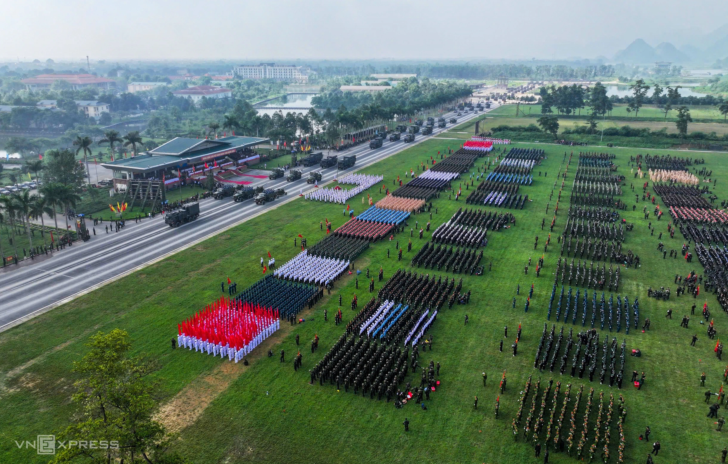 Từ sáng sớm, tại Trung tâm Huấn luyện quân sự quốc gia 4 (Mỹ Đức, Hà Nội), lực lượng diễu binh diễu hành của Quân đội và Công an tổng hợp luyện sau giai đoạn tập luyện và hợp luyện cụm gồm 43 khối đi, 18 khối đứng với hơn 15.600 quân nhân.