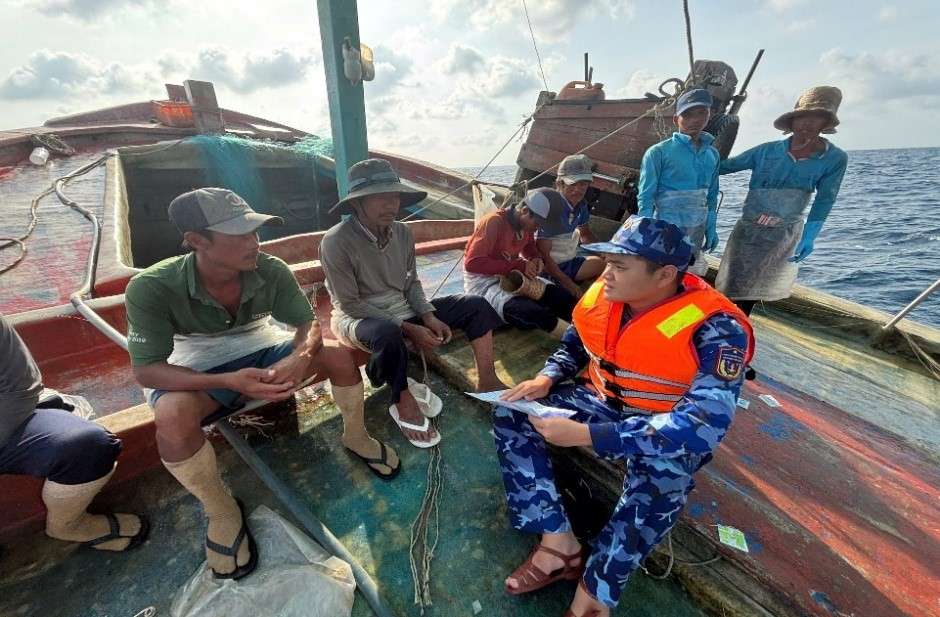 Cán bộ Tàu CSB 4039 tuyên truyền pháp luật cho ngư dân.