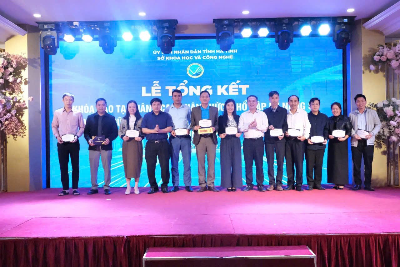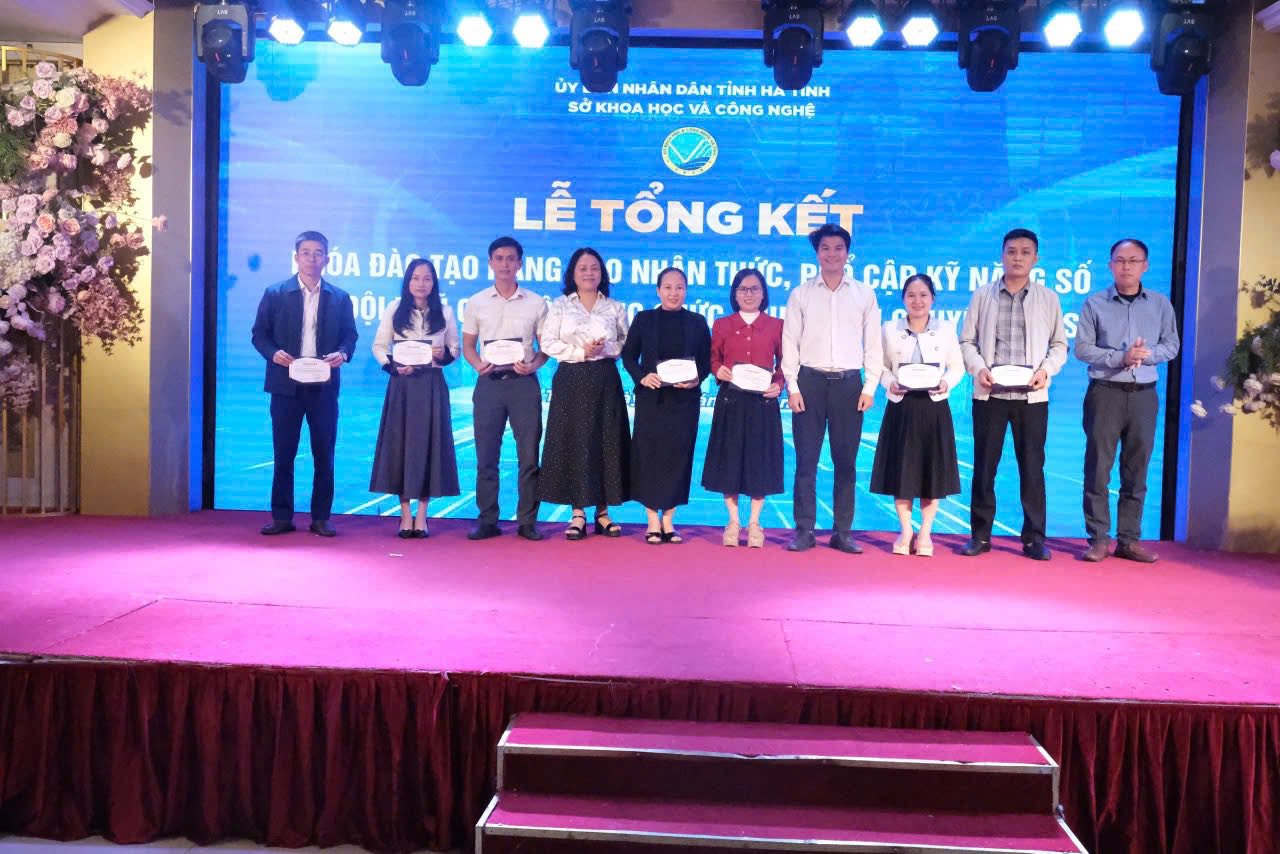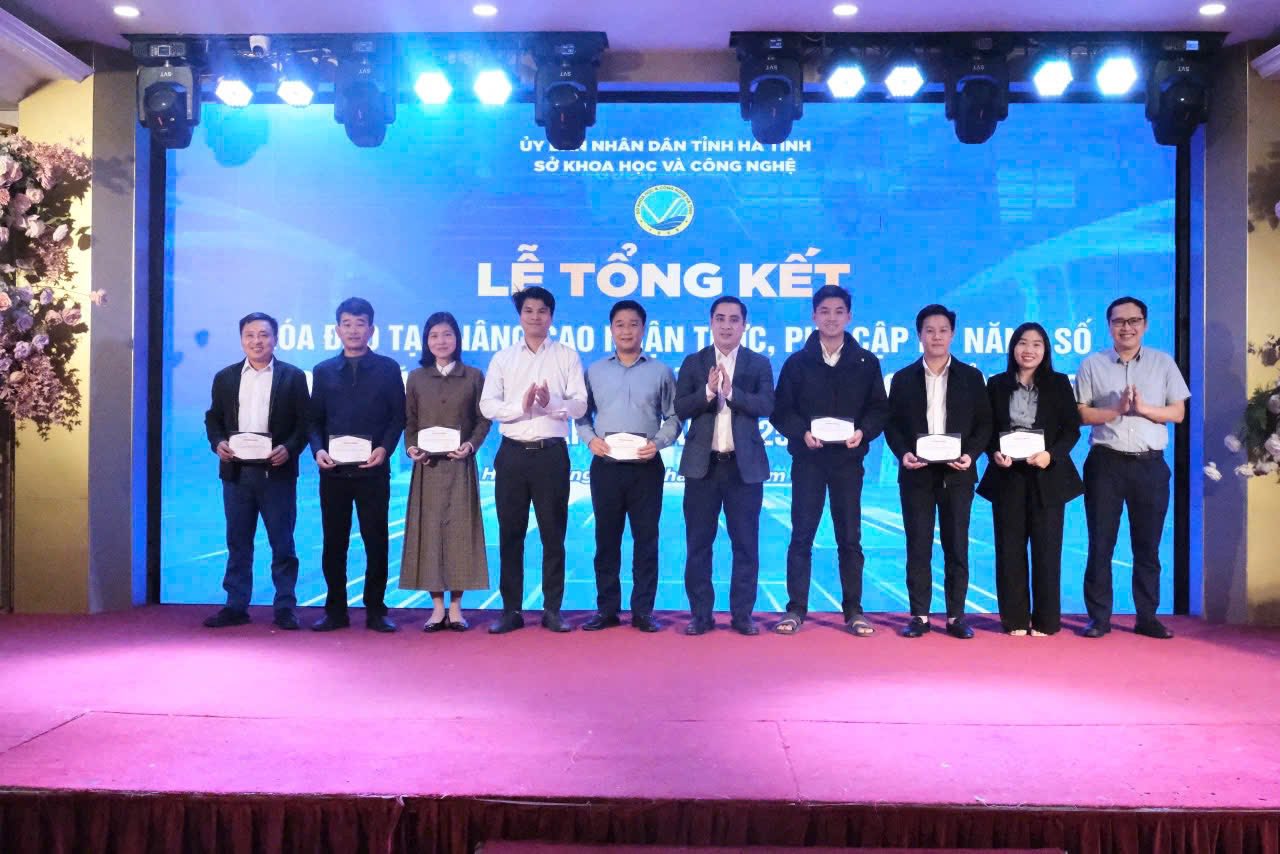 Tại lễ bế mạc, đồng chí Lê Thành Đông – Tỉnh ủy viên, Giám đốc Sở KH&CN, đồng chí Dương Kim Nga – Phó Giám đốc Sở, cùng lãnh đạo Phòng Chuyển đổi số và Trung tâm KH&CN & CĐS đã trao thưởng cho 14 học viên xuất sắc và cấp giấy chứng nhận hoàn thành khóa học cho toàn bộ học viên tham dự.