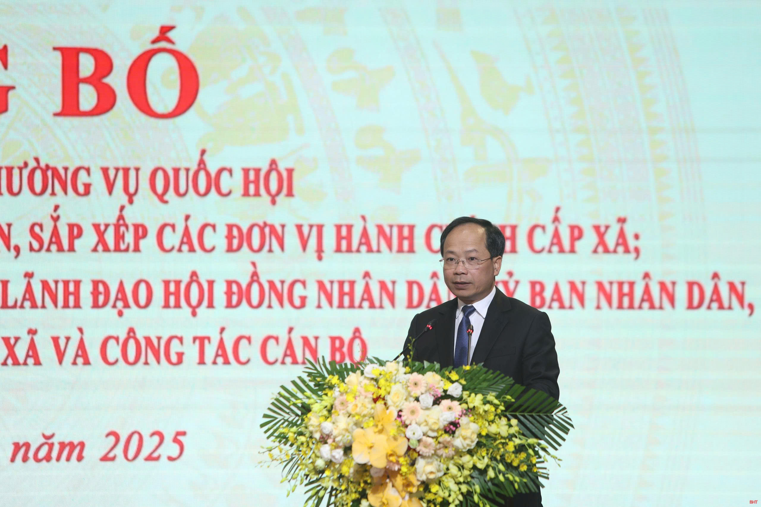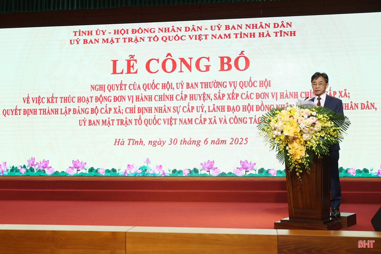 Sáng nay (30/6), tỉnh Hà Tĩnh trọng thể tổ chức Lễ công bố Nghị quyết của Quốc hội, Ủy ban Thường vụ Quốc hội về việc kết thúc hoạt động đơn vị hành chính cấp huyện, sắp xếp các đơn vị hành chính cấp xã; quyết định thành lập đảng bộ cấp xã; chỉ định nhân sự cấp ủy, lãnh đạo HĐND, UBND, ủy ban MTTQ cấp xã và công tác cán bộ.