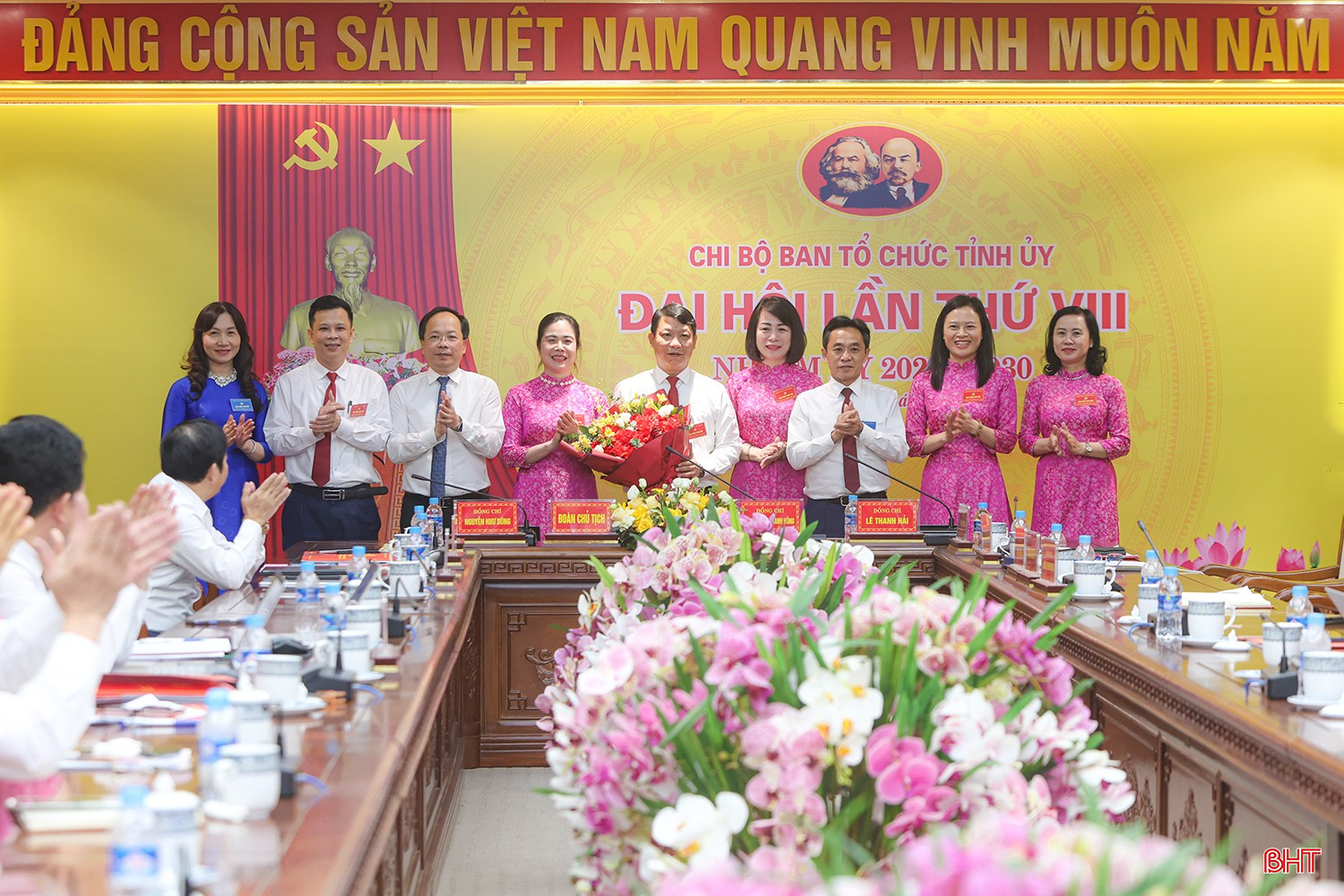 Bí thư Tỉnh ủy Nguyễn Duy Lâm và các đồng chí lãnh đạo tỉnh tặng hoa chúc mừng Ban Chấp hành Chi bộ Ban Tổ chức Tỉnh ủy nhiệm kỳ 2025 - 2030.