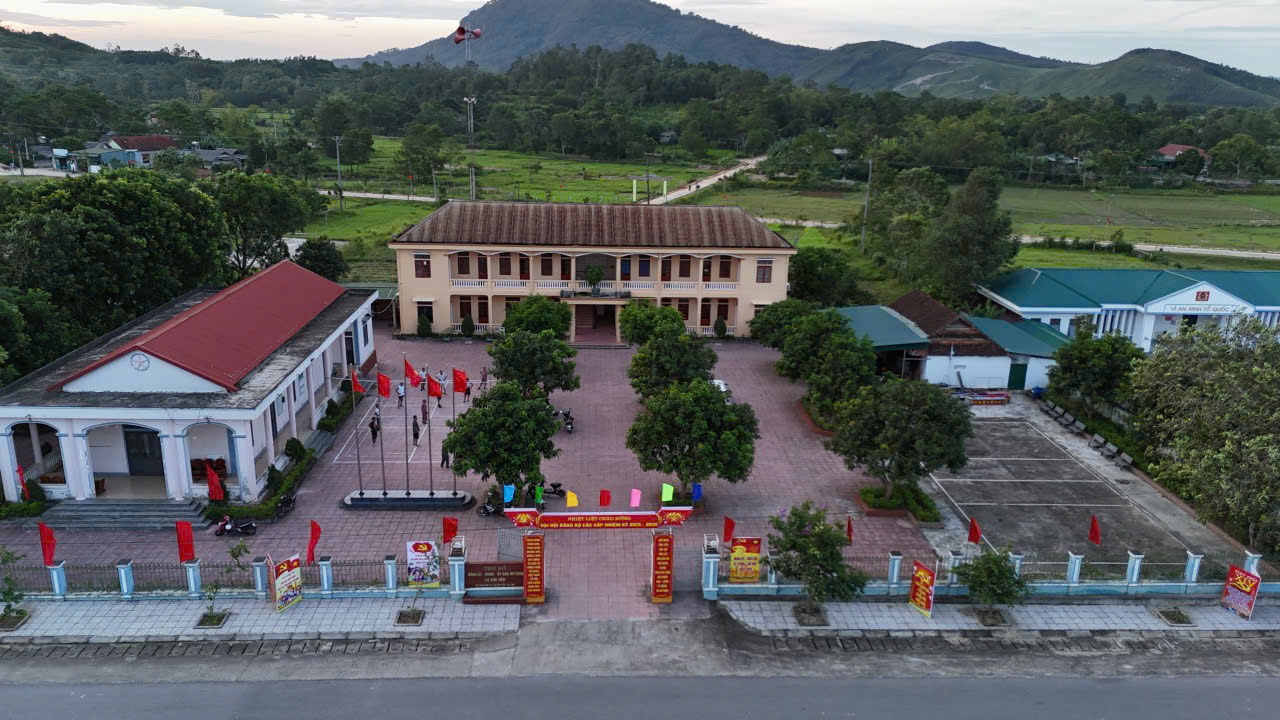 Trụ sở xã Sơn Tiến trang trí cờ, maket rực rỡ chào mừng Đại hội Đảng các cấp