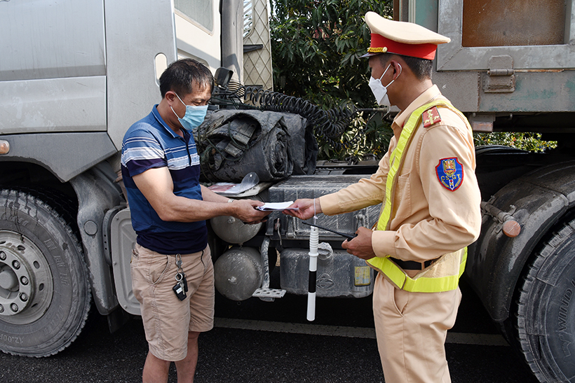 Lực lượng CSGT làm nhiệm vụ trên đường QL 8 nhắc nhở tài xế chở đúng trọng tải, chú ý đảm bảo an toàn khi lưu thông trên đoạn đường đang thi công này.