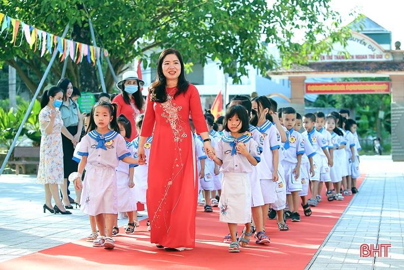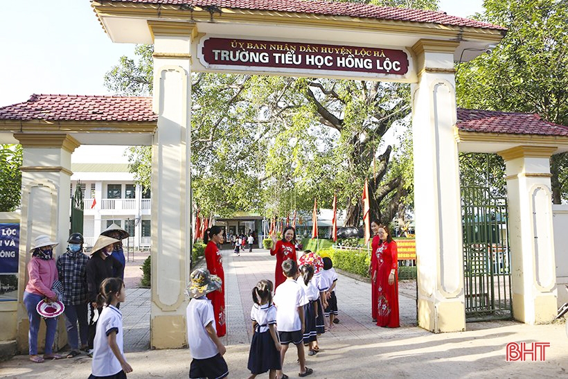 Trường Tiểu học Hồng Lộc (Lộc Hà) đón 125 học sinh vào lớp 1. Từ sáng sớm, sân trường đã được trang hoàng cờ hoa rực rỡ, các cô giáo trong trang phục áo dài đón học sinh lớp ở cổng trường.