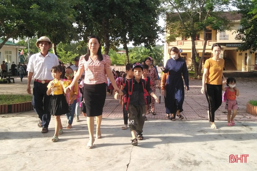 Tại Trường Tiểu học và THCS Quang Thọ (Vũ Quang), không khí ngày tựu trường của học sinh lớp 1 cũng được nhà trường tổ chức nghiêm túc, đúng quy định.