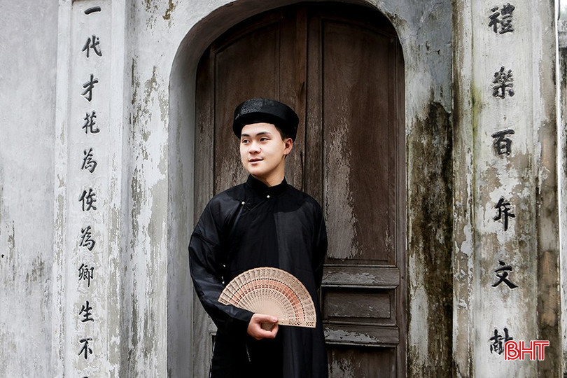Học sinh Trường THPT Nguyễn Du hóa thân thành nho sĩ xưa trước không gian điện thờ Đại thi hào ở Di tích Nguyễn Du.