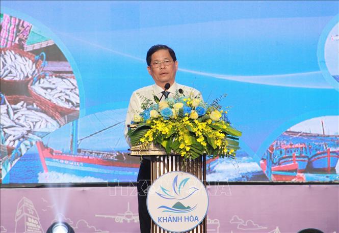 Ông Nguyễn Tấn Tuân, Chủ tịch Ủy ban nhân dân tỉnh Khánh Hòa phát biểu kêu gọi người dân tiếp tục ủng hộ Quỹ hỗ trợ, phát triển nghề cá tỉnh Khánh Hòa. Ảnh: Phan Sáu/TTXVN