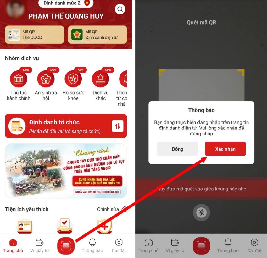 Từ giao diện của ứng dụng VNeID, bạn nhấn vào biểu tượng quét mã, sau đó quét mã QR có trên giao diện trang web dịch vụ công để đăng nhập vào tài khoản VNeID trên trang web. Nhấn nút "Xác nhận" từ hộp thoại hiện ra và điền mã PIN bảo mật trên ứng dụng VNeID.