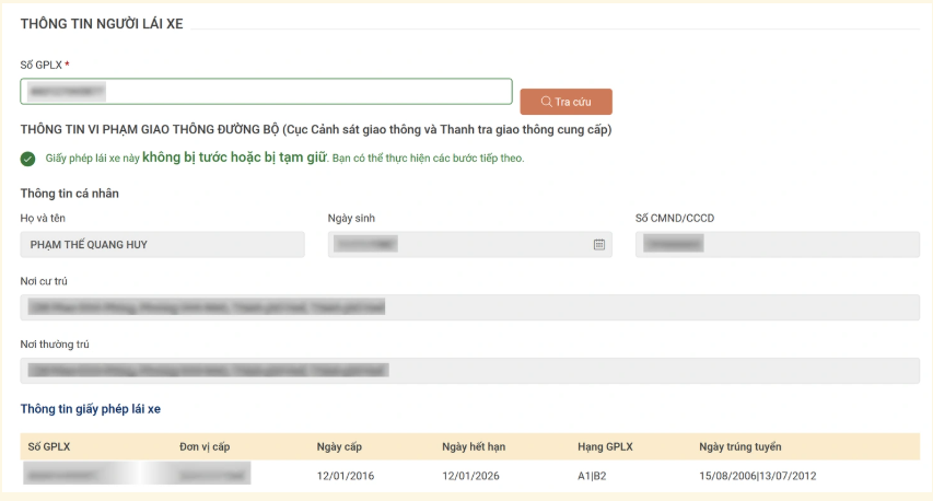 Tại phần "Thông tin người lái xe" ở bên dưới, bạn chỉ việc nhập số GPLX vào khung trống và nhấn nút "Tra cứu", thông tin cá nhân sẽ tự động được điền vào các khung tương ứng. Bạn có thể xem số GPLX in trên bằng lái hoặc trên ứng dụng VNeID (nếu đã tích hợp GPLX vào ứng dụng).
