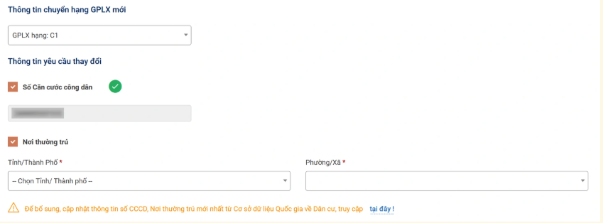 Tại mục “Thông tin chuyển hạng GPLX mới”, bạn chọn “GPLX hạng C1” hoặc “GPLX hạng B” (sự khác biệt về 2 loại giấy phép lái xe này sẽ được đề cập ở dưới).