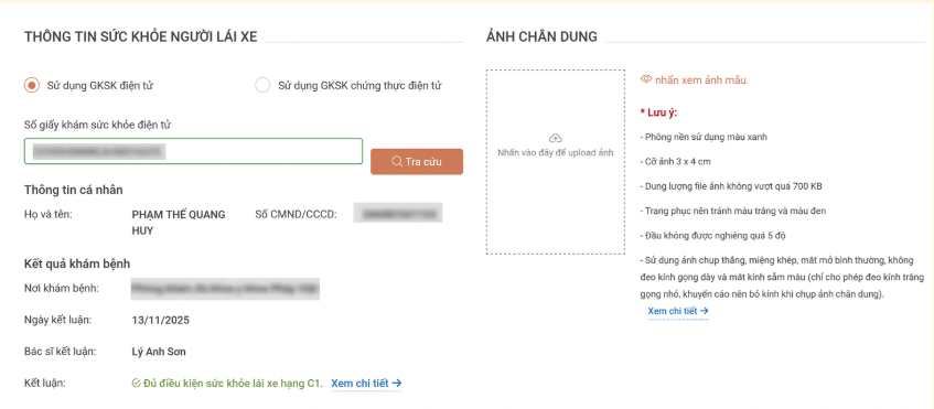Tại mục "Thông tin sức khỏe người lái xe", bạn nhập mã giấy khám sức khỏe điện tử và nhấn nút "Tra cứu", thông tin hồ sơ sẽ tự động được cập nhật mà không cần phải đính kèm bản scan giấy khám sức khỏe.