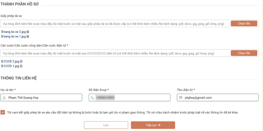 Tiếp theo, bạn đính kèm ảnh chụp chân dung (nền xanh, cỡ 3x4), ảnh chụp 2 mặt GPLX và CCCD, đánh dấu cam kết thông tin khai báo là chính xác và nhấn nút "Tiếp tục".