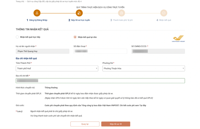 - Tại bước tiếp theo, bạn chọn "Nhận kết quả tại nhà" và điền đầy đủ thông tin người nhận để bưu điện gửi GPLX mới về tận địa chỉ đã khai báo.