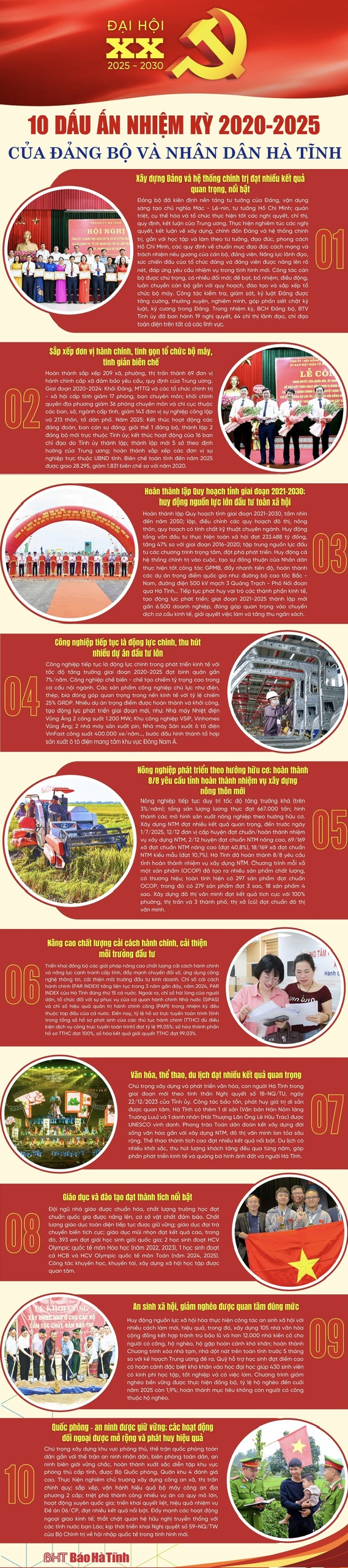 10 dấu ấn nhiệm kỳ của Đảng bộ và Nhân dân Hà Tĩnh Cỡ chữ Ngày đăng: 14:43 29/09/2025 Nguồn: BTT Tin này, chưa cập nhật nội dung để máy đọc. Mời bạn quay lại sau. Z Tin mới đăng Hà Tĩnh có 6 dự án khởi công, khởi động chào mừng Đại hội XIV của Đảng (07-12-2025) MTTQ tỉnh Hà Tĩnh phát huy trí tuệ, góp ý văn kiện Đại hội XIV của Đảng (07-11-2025) Đại biểu Quốc hội Hà Tĩnh tích cực góp ý dự thảo các văn kiện trình Đại hội XIV của Đảng (05-11-2025) Tổ chức các hoạt động tuyên truyền trực quan Đại hội Đảng lần thứ XIV (30-10-2025) Ban tuyên giáo và Dân vận Đảng ủy UBND tỉnh Hà Tĩnh định hướng nội dung trọng tâm tuyên truyền tháng 11/2025 (29-10-2025) Dự kiến Đại hội XIV của Đảng diễn ra trong 7 ngày (24-10-2025) Tiếp tục đẩy mạnh thực hiện xây dựng mô hình “Dân vận khéo” trên địa bàn tỉnh Hà Tĩnh (23-10-2025) Một số vấn đề mới, quan trọng trong dự thảo các Văn kiện trình Đại hội XIV của Đảng (22-10-2025) Hà Tĩnh triển khai lấy ý kiến dự thảo các văn kiện Đại hội XIV của Đảng (21-10-2025) Phường Thành Sen quyết tâm hiện thực hóa Nghị quyết Đại hội Đảng các cấp (17-10-2025)