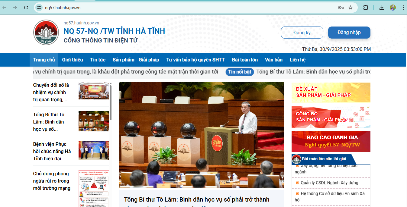 Cổng TTĐT thực hiện Nghị quyết số 57-NQ/TW tỉnh Hà Tĩnh - không gian số hoá - cầu nối giữa chính quyền, doanh nghiệp và người dân trên địa bàn tỉnh.