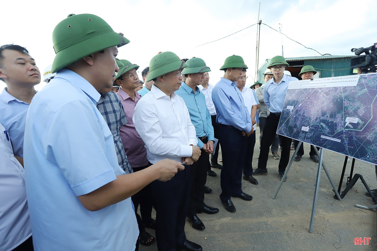 Bí thư Tỉnh ủy Nguyễn Duy Lâm và đoàn công tác nghe báo cáo về dự án cải tạo, nâng cấp quốc lộ 8C đoạn từ Thiên Cầm - quốc lộ 1 và đoạn từ quốc lộ 8 đến đường Hồ Chí Minh tại đoạn tuyến qua xã Cẩm Xuyên.