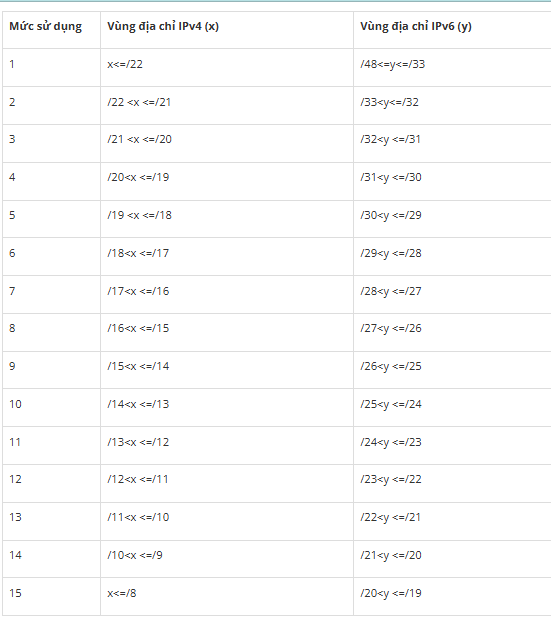 Theo đó các tổ chức đã được cấp và đang duy trì sử dụng địa chỉ IPv4 sẽ có quyền lợi được sử dụng miễn phí một lượng địa chỉ IPv6 tương ứng với số lượng địa chỉ IPv4 đang duy trì như trong bảng sau đây: