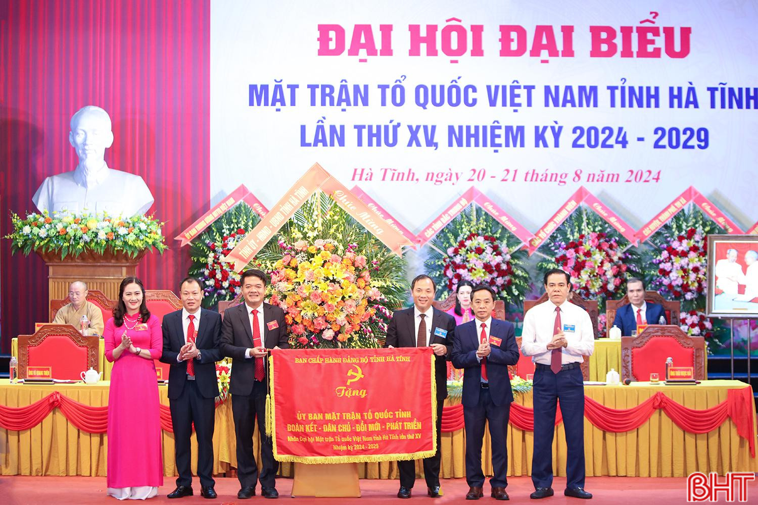 Phó Chủ tịch Ủy ban Trung ương MTTQ Việt Nam Nguyễn Hữu Dũng, Bí thư Tỉnh ủy Hoàng Trung Dũng, Chủ tịch UBND tỉnh Võ Trọng Hải tặng hoa, chúc mừng Ủy ban MTTQ tỉnh khóa XV nhiệm kỳ 2024 - 2029.