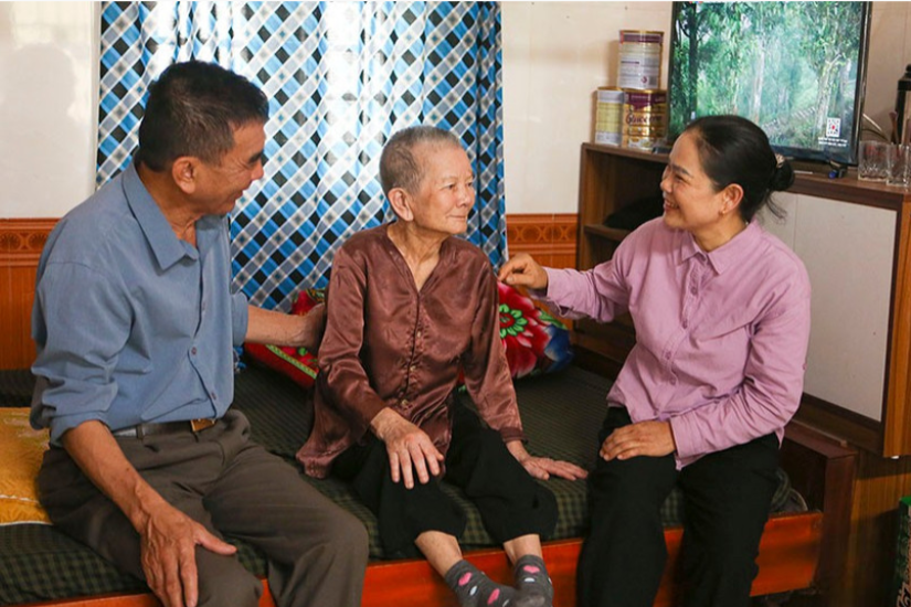 Nhiều năm qua, ông Chương và bà Nguyệt được người dân quý mến bởi tấm lòng hiếu thảo đối với 2 người mẹ nội, ngoại. Trong ảnh: Ông Chương và bà Nguyệt chăm sóc bà Ngô Thị Hảo (vợ liệt sỹ Trần Trọng Đường) là mẹ ruột ông Chương.