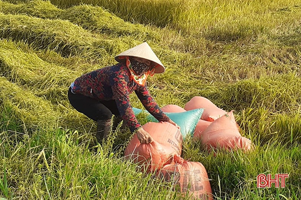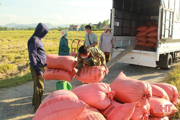 Lúa của người dân xã Kim Song Trường (Can Lộc) được thương lái thu mua tại chân ruộng.