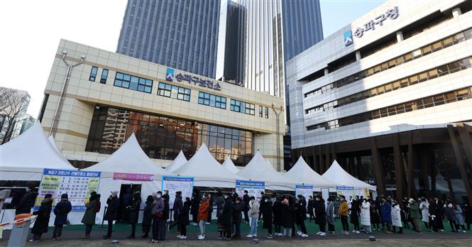 Người dân xếp hàng chờ xét nghiệm COVID-19 tại Seoul, Hàn Quốc, ngày 18/2/2022. Ảnh: THX/ TTXVN