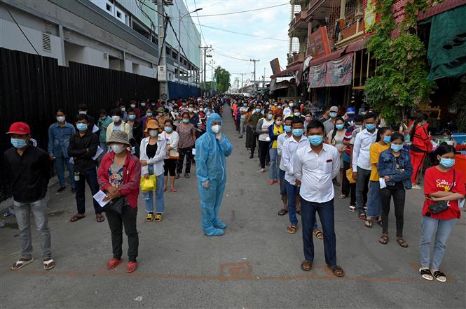 Người dân xếp hàng chờ tiêm vaccine phòng COVID-19 tại Phnom Penh, Campuchia. Ảnh: AFP/TTXVN