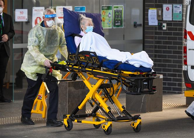Nhân viên y tế chuyển người già khỏi viện dưỡng lão ở Epping Melbourne, Australia khi dịch COVID-19 bùng phát tại đây. Ảnh: AFP/TTXVN