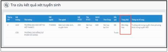Trạng thái thông tin của thí sinh "Đã nhập học" nghĩa là thí sinh đã xác nhận nhập học thành công và trường đại học đã nhận được thông tin xác nhận nhập học của thí sinh. Khi đã xác nhận nhập học xong, thí sinh sẽ không được hủy xác nhận nhập học, nếu muốn hủy xác nhận nhập học phải liên hệ với trường đại học đó để được giải quyết.