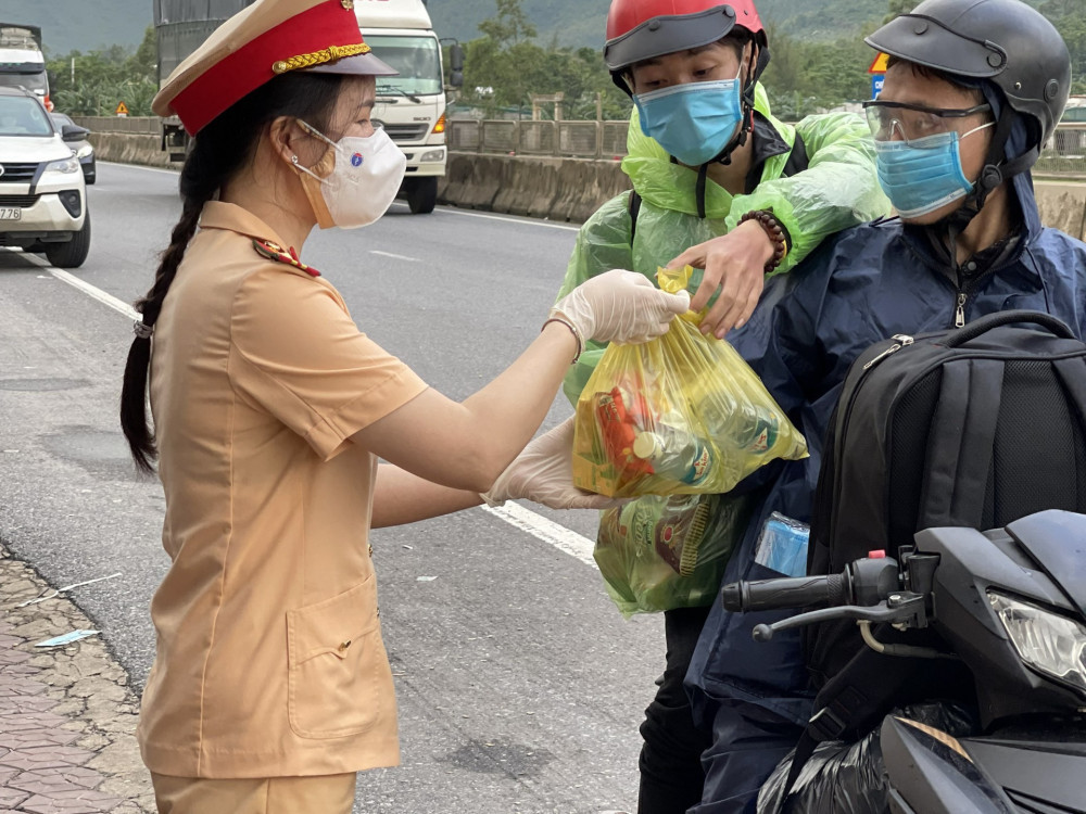 Lực lượng Cảnh sát giao thông dẫn đoàn và hỗ trợ người dân về quê đi qua địa bàn tỉnh Hà Tĩnh