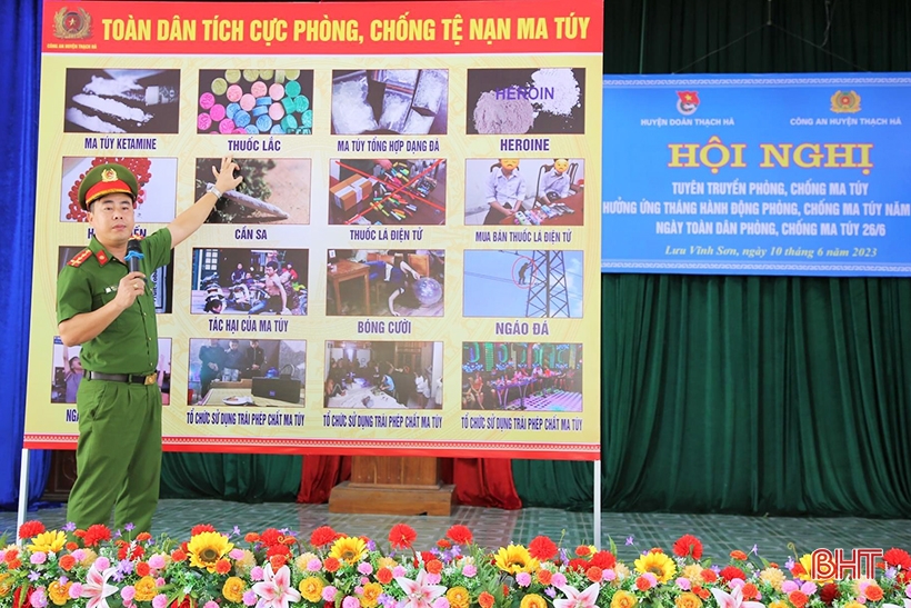 Công an huyện Thạch Hà giới thiệu các loại ma tuý phổ biến tại hội nghị tuyên truyền pháp luật ở xã Lưu Vĩnh Sơn.