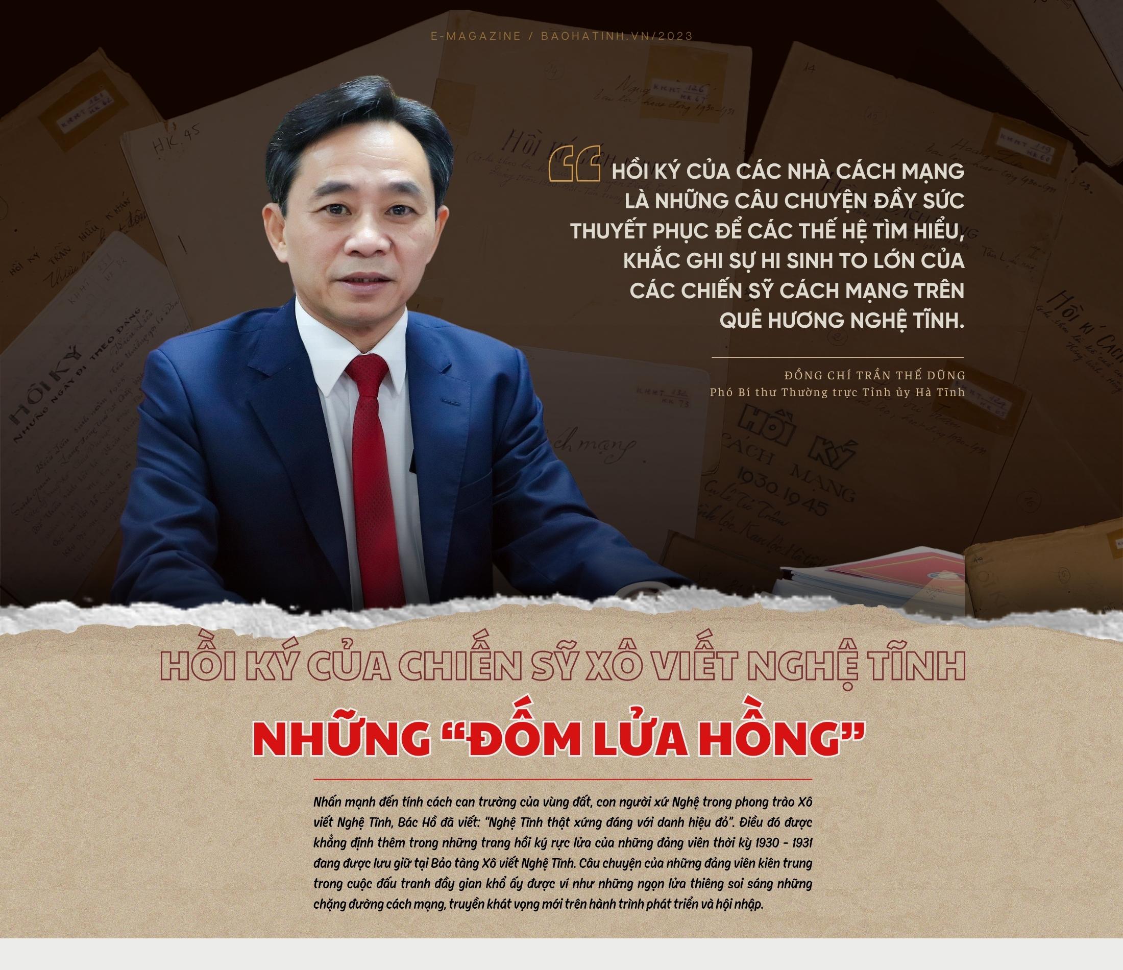Trò chuyện với Phó Bí thư Thường trực Tỉnh ủy Trần Thế Dũng về những ký ức còn xanh mãi trong dòng thời gian của các nhà cách mạng trong phong trào Xô viết Nghệ Tĩnh, chúng tôi được đồng chí khẳng định thêm những giá trị to lớn của cao trào cách mạng đầu tiên dưới sự lãnh đạo của Đảng và những bài học quý mà Hà Tĩnh vận dụng, phát huy trên hành trình thực hiện lời căn dặn của Bác Hồ: “Hà Tĩnh phải làm sao cho tình hình nổi bật lên”.