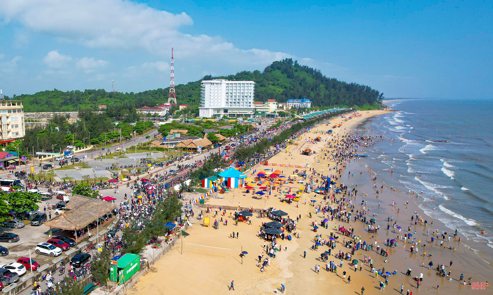 Khu du lịch Thiên Cầm là động lực, tiềm năng lợi thế để thị trấn Thiên Cầm xây dựng đô thị văn minh. Trong ảnh: Tấp nập du khách tại Khu du lịch Thiên Cầm (tháng 5/2023).