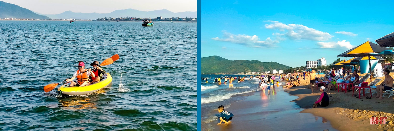 Du khách trải nghiệm tour "Khám phá biển Thiên Cầm ”, dịp tháng 6/2023 (ảnh trái). Biển Thiên Cầm là điểm đến yêu thích của du khách trong và ngoài tỉnh (ảnh phải). Ảnh: Thiên Vỹ
