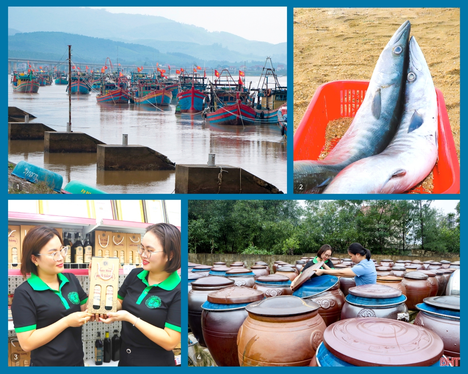 Thị trấn Thiên Cầm hiện có 67 thuyền đánh bắt vùng bãi ngang và 17 thuyền đánh bắt xa bờ (ảnh 1). Đánh bắt, khai thác thủy sản là ngành nghề chủ yếu của người dân thị trấn Thiên Cầm (ảnh 2). Mô hình sản xuất nước mắm Phú Sáng của thị trấn Thiên Cầm đạt tiêu chuẩn OCOP 3 sao (ảnh 3). Thị trấn Thiên Cầm đẩy mạnh phát triển ngành nghề chế biến thủy sản để nâng cao thu nhập cho người dân (ảnh 4).