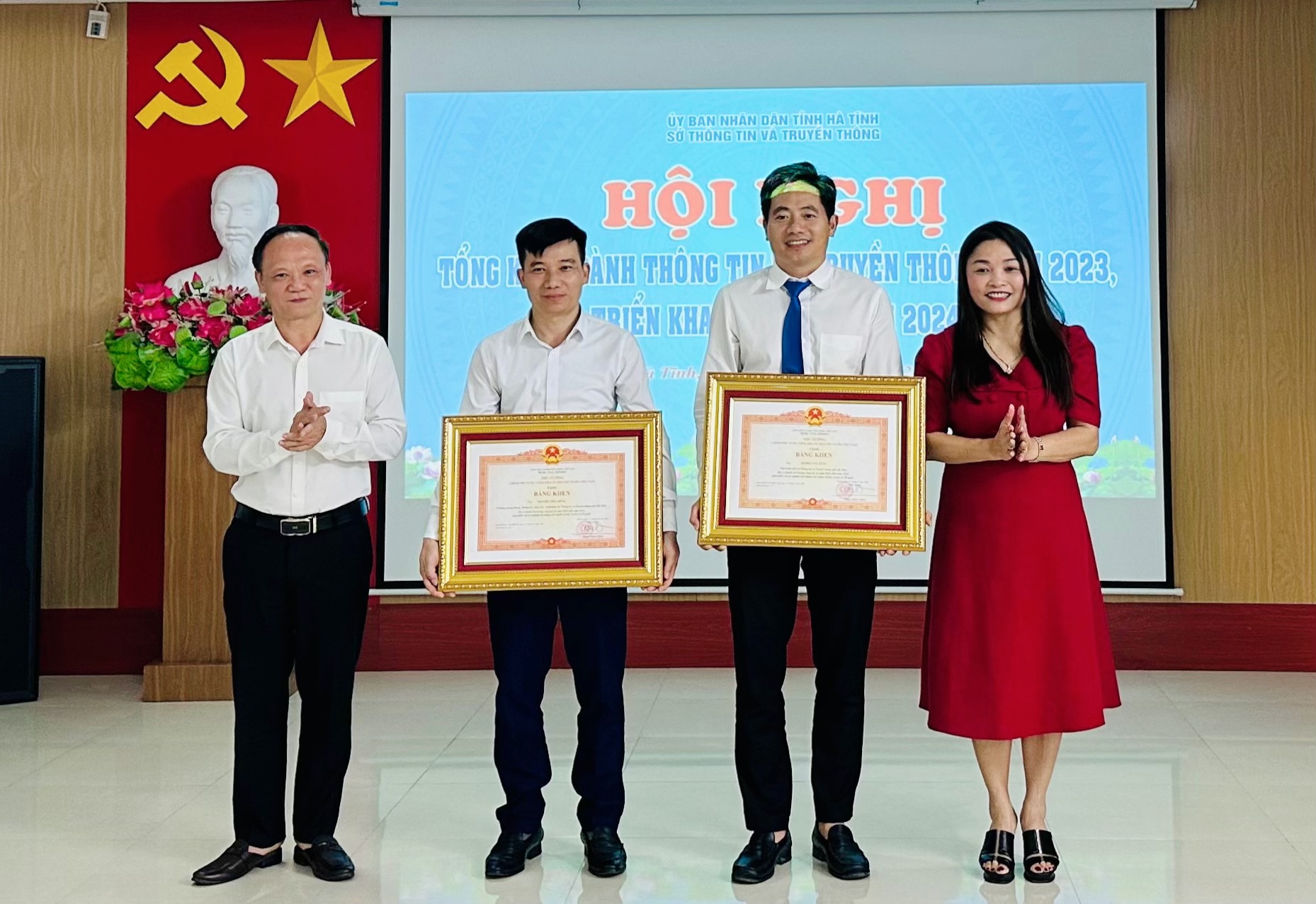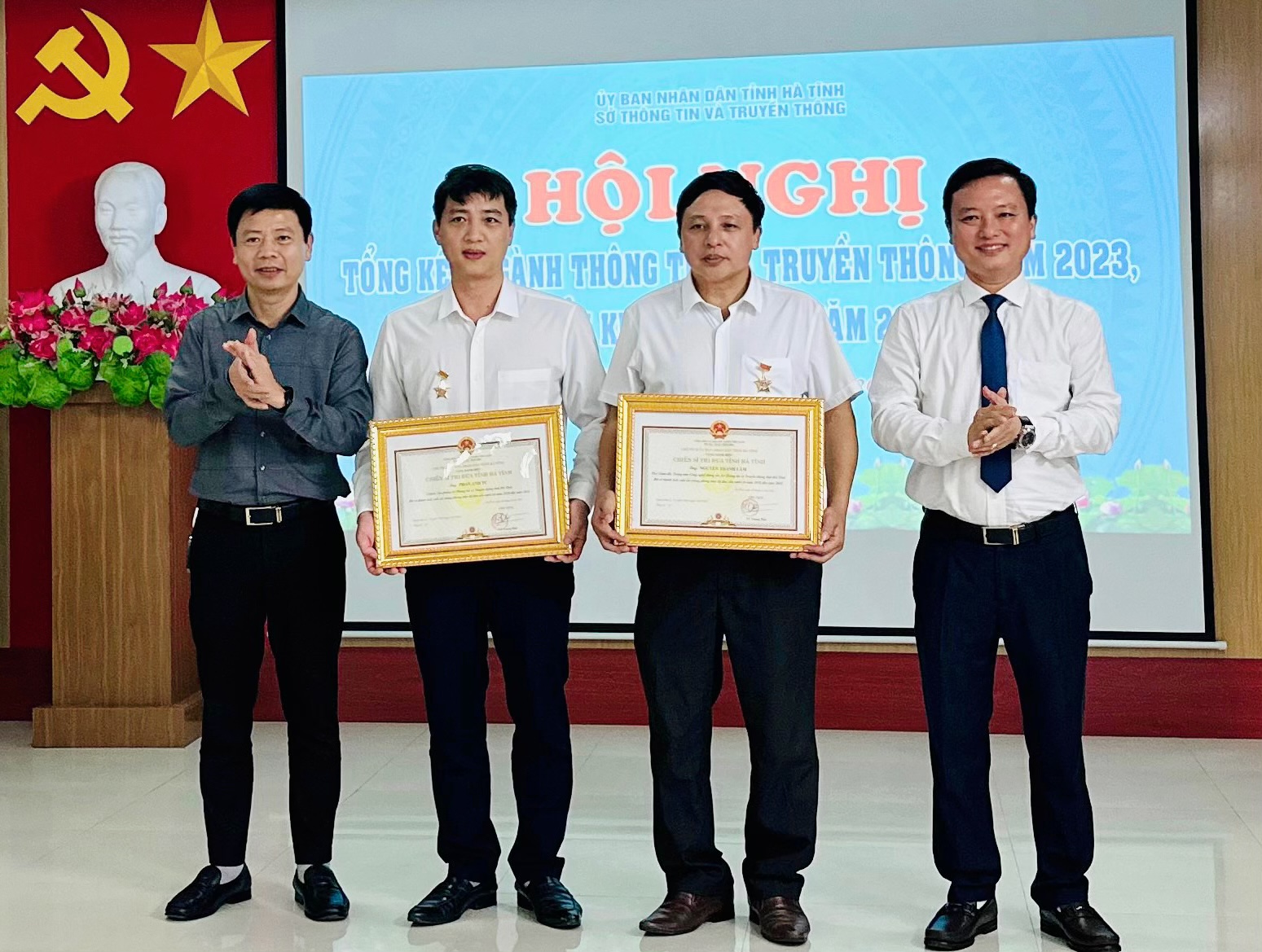 Đồng chí Đậu Tùng Lâm-Giám đốc Sở TTTT; Đồng chí Nguyễn Công Thành – TBT Báo Hà Tĩnh trao Danh hiện Chiến sỹ thi đua cấp tỉnh cho 2 cá nhân
