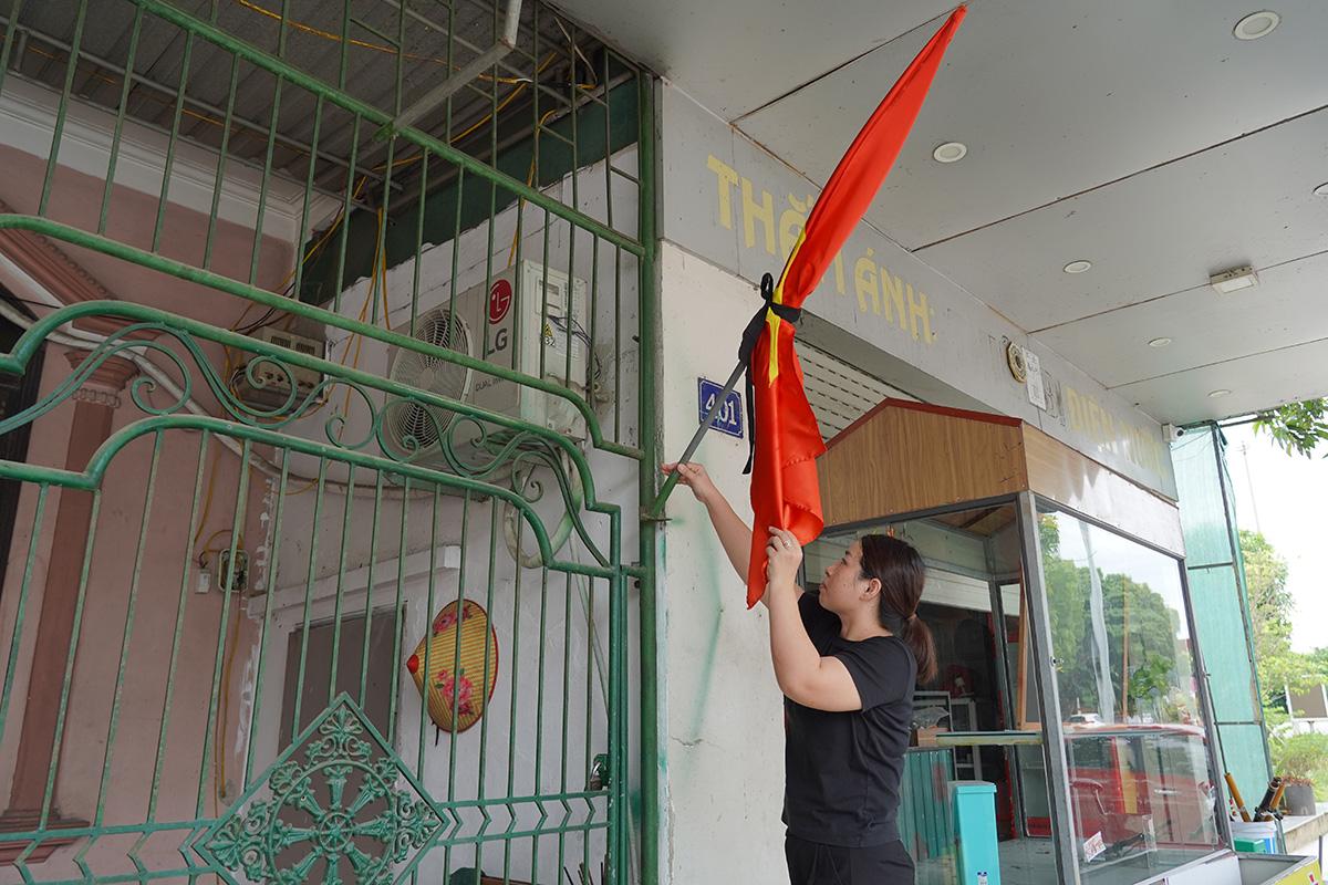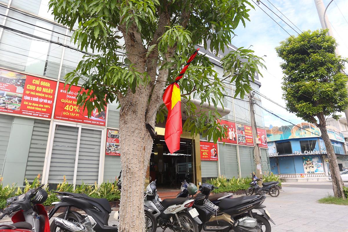 Nhiều cơ sở kinh doanh, khu dân cư cũng bắt đầu thực hiện việc treo cờ rủ tưởng niệm Tổng Bí thư Nguyễn Phú Trọng. Trong ảnh: Hình ảnh lá cờ Tổ quốc được gắn dải băng đen tại các cơ sở kinh doanh ở TP Hà Tĩnh.