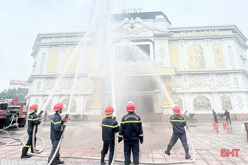 Phòng Cảnh sát PCCC&CNCH tiến hành diễn tập tại Karaoke Ruby (phường Thành Sen, tỉnh Hà Tĩnh).