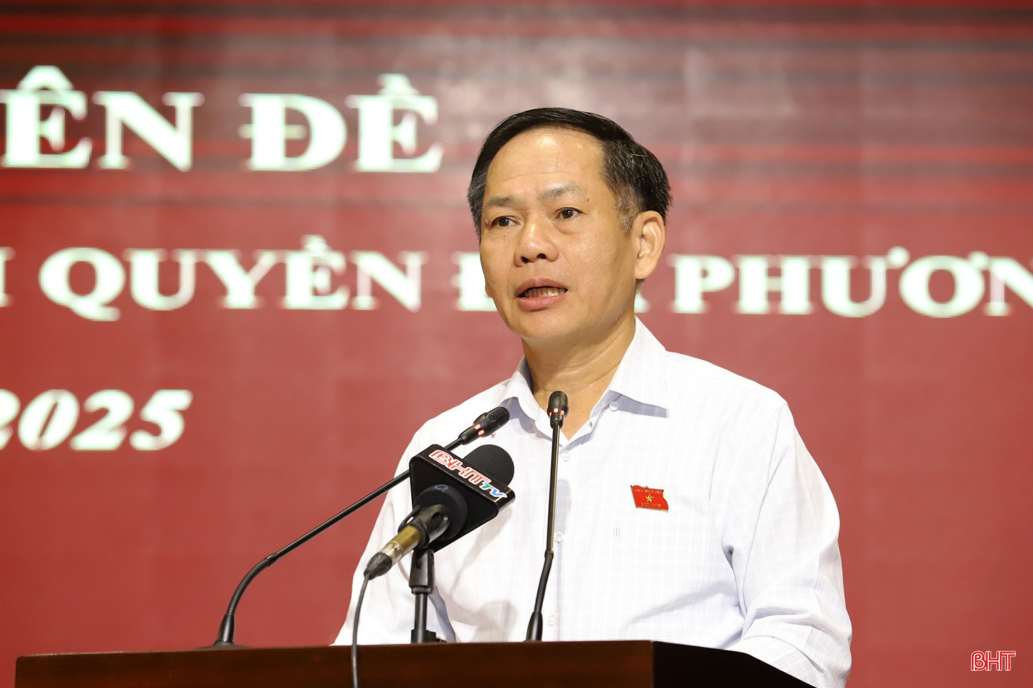 Thay mặt lãnh đạo tỉnh, Bí thư Tỉnh ủy đề nghị ĐBQH xem xét, phản ánh tại nghị trường Quốc hội và các diễn đàn của Trung ương về việc quan tâm chỉ đạo, sớm triển khai đầu tư tuyến đường sắt Viêng Chăn – Vũng Áng theo thỏa thuận cấp cao giữa hai nước; sớm cho chủ trương xử lý dứt điểm các vướng mắc liên quan Dự án khai thác và tuyển quặng sắt mỏ Thạch Khê; hoàn thiện hệ thống pháp luật về chính quyền địa phương 2 cấp và tăng cường hướng dẫn, hỗ trợ địa phương trong thực hiện phân cấp, phân quyền; Bộ Nội vụ sớm có hướng dẫn cụ thể về giải quyết chế độ, chính sách và bố trí, sử dụng người hoạt động không chuyên trách cấp xã sau sắp xếp.