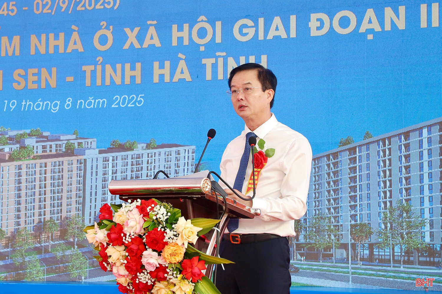Phát biểu tại buổi lễ, Phó Chủ tịch UBND tỉnh Trần Báu Hà nhấn mạnh: Lễ khởi công dự án thí điểm nhà ở xã hội giai đoạn II hôm nay một lần nữa khẳng định quyết tâm của Hà Tĩnh trong việc cụ thể hóa các chủ trương, chính sách của Đảng và Nhà nước về chăm lo chỗ ở cho cán bộ, viên chức, người lao động và người thu nhập thấp. Đồng thời, tạo tiền đề để tỉnh hoàn thành mục tiêu về nhà ở xã hội giai đoạn 2025 - 2030, góp phần đảm bảo an sinh xã hội, xây dựng đô thị văn minh, hiện đại.