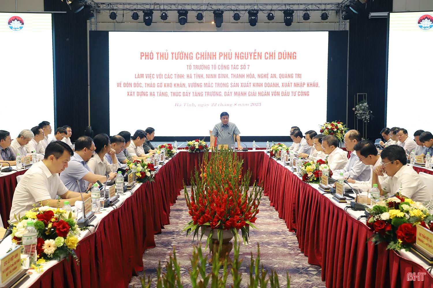 Sáng 22/8, tại tỉnh Hà Tĩnh, Phó Thủ tướng Chính phủ Nguyễn Chí Dũng - Tổ trưởng Tổ công tác số 7 của Chính phủ làm việc với các tỉnh Ninh Bình, Thanh Hóa, Nghệ An, Hà Tĩnh, Quảng Trị về đôn đốc, tháo gỡ khó khăn, vướng mắc trong sản xuất kinh doanh, xuất nhập khẩu, xây dựng hạ tầng, thúc đẩy tăng trưởng, đẩy mạnh giải ngân vốn đầu tư công.