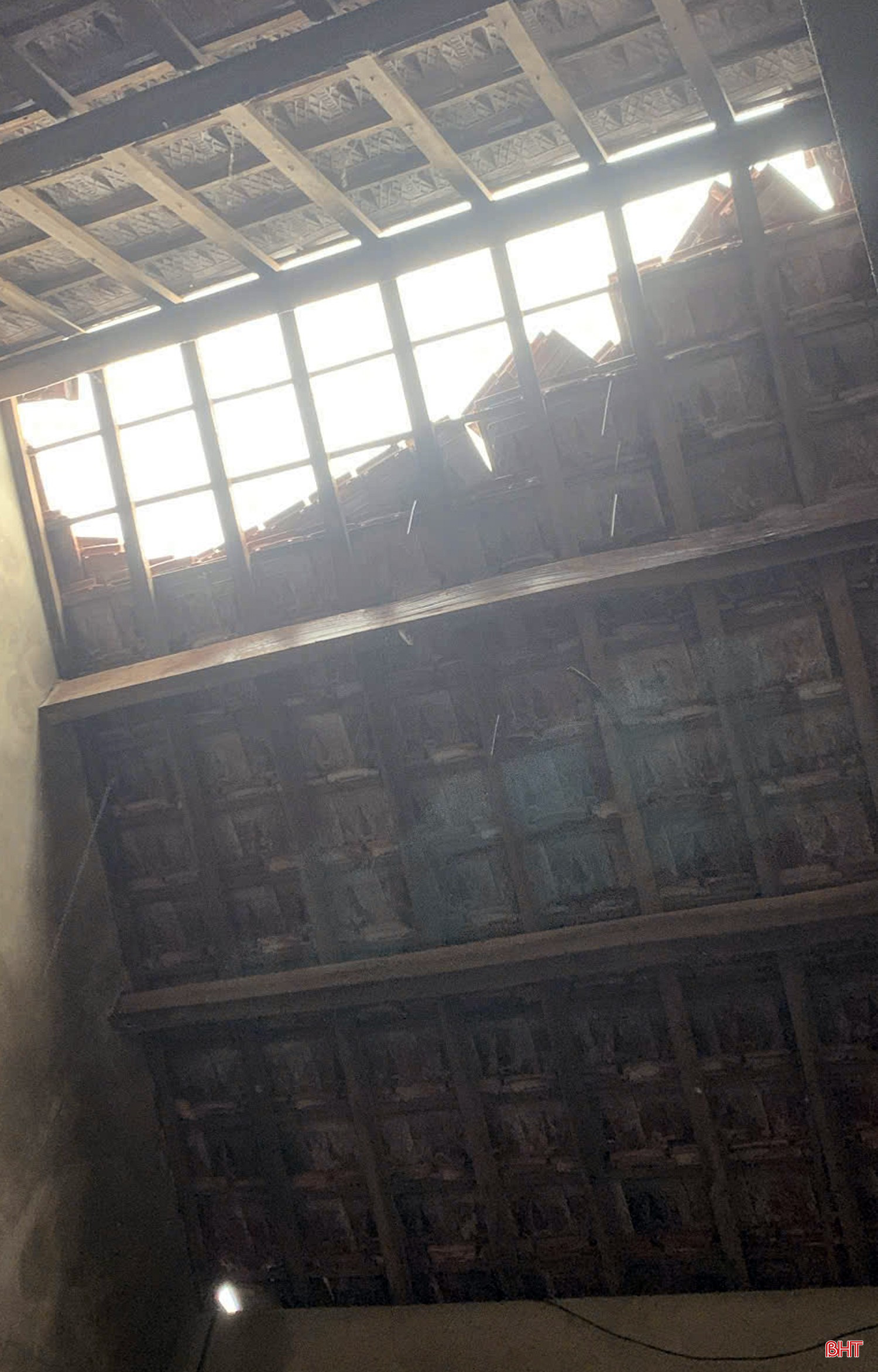 Dãy nhà học 2 tầng của Trường Tiểu học Đỉnh Bàn bị gió thổi bay mái tôn.